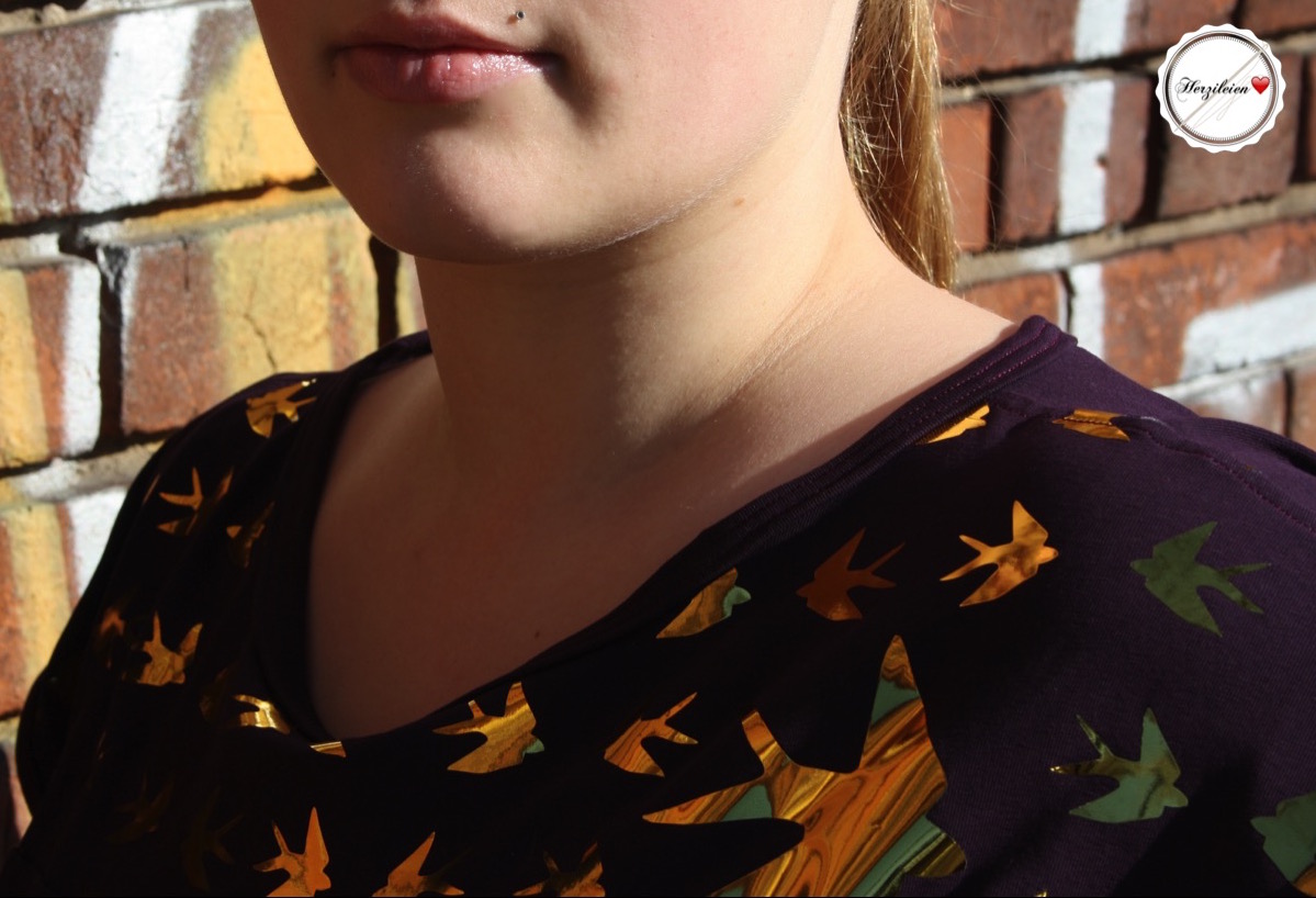 Dieses Mal bin ich einen ganz anderen Weg gegangen. Ich hatte schon bei der Masha eine Begeisterung für das Unterteilen eines einfachen T-shirts entwickelt, denn ohne die Passe wäre Masha nicht halb so aufregend. Aus dieser Begeisterung reifte die Idee einen ganz schlichten Schnitt, ich habe mich für das Kinono-Tee von Maria Denmark entschieden, selber zu teilen und die dabei entstehende Passe mit einem Muster aus Schwalben zu einem eigenen Motiv-Stoff zu gestalten. Alle geplottet natürlich.