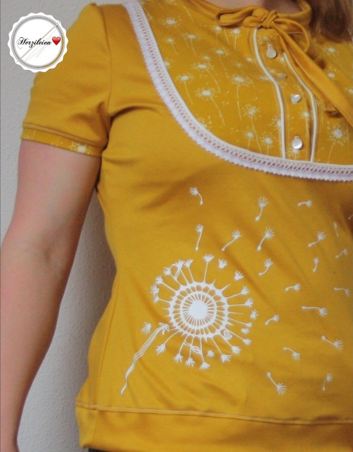Manchmal will es das Schicksal dann aber doch, dass man etwas sieht, das geplottet wurde und sich im Kopf direkt das fertige Bild eines Kleidungsstücks formt. So ging es mir bei der Pusteblumendatei von „Fusselfreies„. Ich hatte bei Staghorn anfang des Monats die tolle Eigenproduktion „Pusteblumen“ in senfgelb gekauft, sah das Bild das Georgie zu ihrer Schnittdatei gepostet hatte und hatte augenblicklich eine Masha vor Augen auf der unten rechts eine große Pusteblume zu sehen ist, deren Samenschirmchen nach links oben Richtung Ärmel über das Shirt trudeln. Da Georgies Pusteblume zu dieser Zeit erst in die Testrunde ging war ich Feuer und Flamme und habe tatsächlich meine Masha als „Unterlage“ für den Plott gestaltet, ungewöhnlich für mich, da ich meist das fertige Nähwerk sehe und mir dann überlege ob ich noch etwas „dekoriere“, aber es hat sich gelohnt- ich denke ich werde meine Herangehensweise diesbezüglich nochmal überdenken.