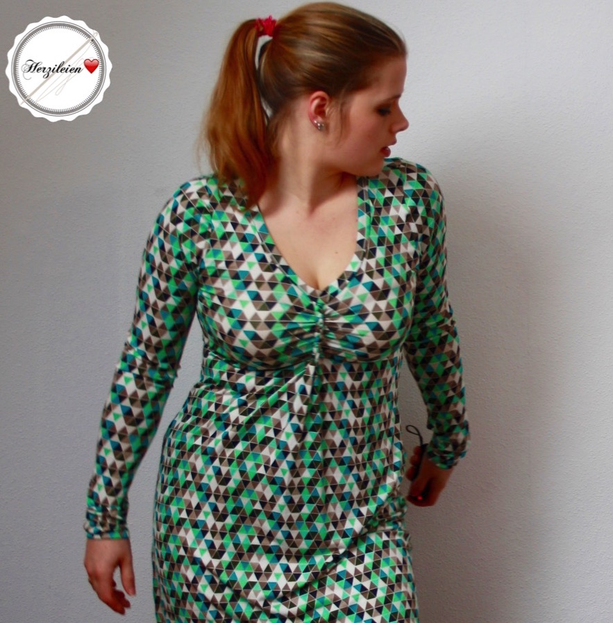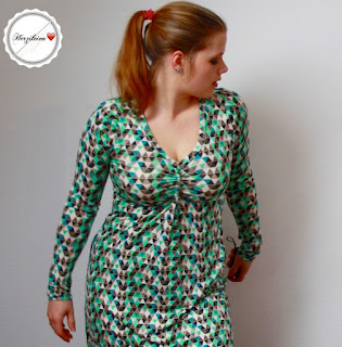Während das Pailettenkleid durch den Stoff eher schwer fällt, ist meine zweite Version aus sehr leichtem Viskosejersey eher anschmiegsam und daurch auch etwas schmeichelhafter. Durch das starke Muster erscheint der Zopf zwar weniger als Zopf, aber er gibt trotzdem eine schöne Raffung im Brustbereich. Den Stoff habe ich übrigens sehr günstig bei Butinette bestellt und mich anschließend geärgert dass ich nicht mehr gekauft habe… Obwohl er bei der Verarbeitung recht flutschig und dadurch anstrengend war.