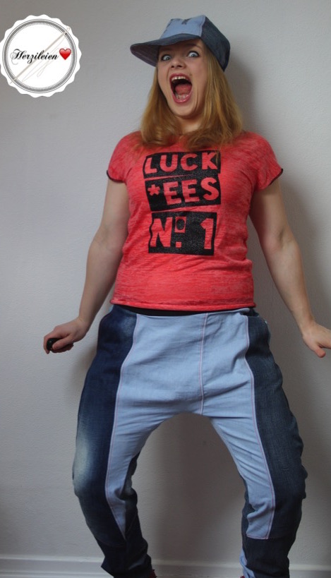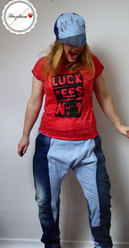 Eine kleine Herausforderung hat es für mich mit sich gebracht: Bisher hatte ich die Luck*ees nur für meinen Mann (hier zu sehen) und meinen Sohn genäht- immer aus Sweat. Für meine Luck*ees schwebte mir aber eine Upcycling- Version aus alten Jeans vor und ich war nicht sicher um wieviel ich den Schnitt Größer wählen muss damit sie anschließend auch passt.