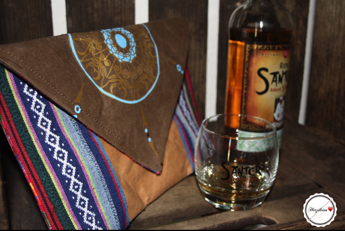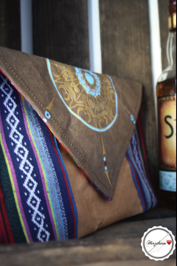 Als Innenfutter habe ich einen gestreiften grob gewebten Stoff verwendet, außen dann auf der Vorderseite die Details aus einem ähnlichen Stoff mit Rautenmuster aufgebracht. In diese Stoffe hatte ich mich schon vor knapp einem Jahr verliebt und sie bestellt ohne so richtig zu Wissen was daraus werden soll. Jetzt bin ich froh über meine Entscheidung, die Kombination mit dem Snappap bringt mich nämlich schon wieder auf weitere Ideen- ich brauche drinkend noch einen neuen Gürtel und besonders zu Jeans gefällt mir der Ethnotouch dieser Stoffe in Kombination mit Leder- oder Snappap- sehr gut.