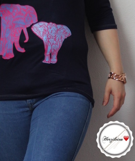 Da ich mit der Position der Dickhäuter noch nicht ganz zufrieden bin werde ich in Zukunft wohl wieder meinen altbewährten Weg gehen und erst dann aufpressen, wenn ich das fertige Stück vor mir liegen habe. Es wirkt doch anders, wenn ein Shirt schon Ärmel und Saum hat, als wenn wan sich diese Details nur dazu denkt um die richtige Position des Bildes festzulegen.