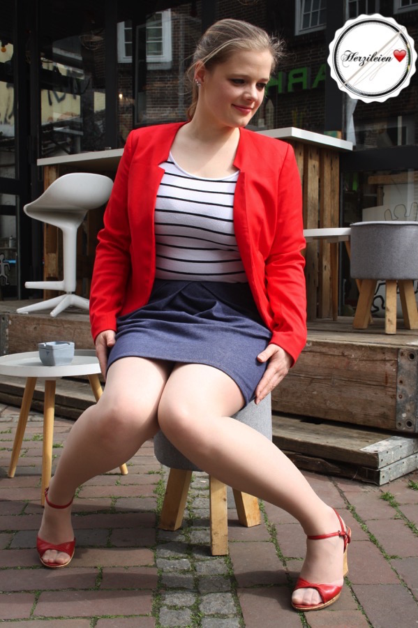Auch die zweite Art der Klassifizierung ist leicht: Evchen ist aus einem etwas festeren Jeansjersey entstanden und somit nach dem Material in der Kategorie Jerseyröcke einzuordnen. Aber was ist mit der Form? Evchen hat Falten- aber ist sie ein Faltenrock? Evchen erfüllt nämlich auch das Kriterium eines Tulpenrocks an der Hüfte weiter zu werden und unten wieder schmal zusammenzulaufen…