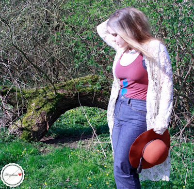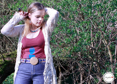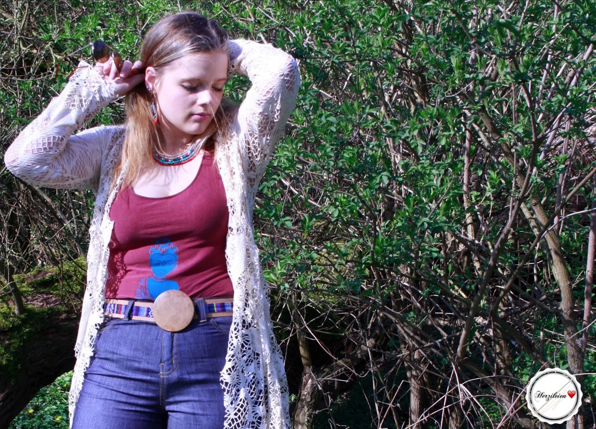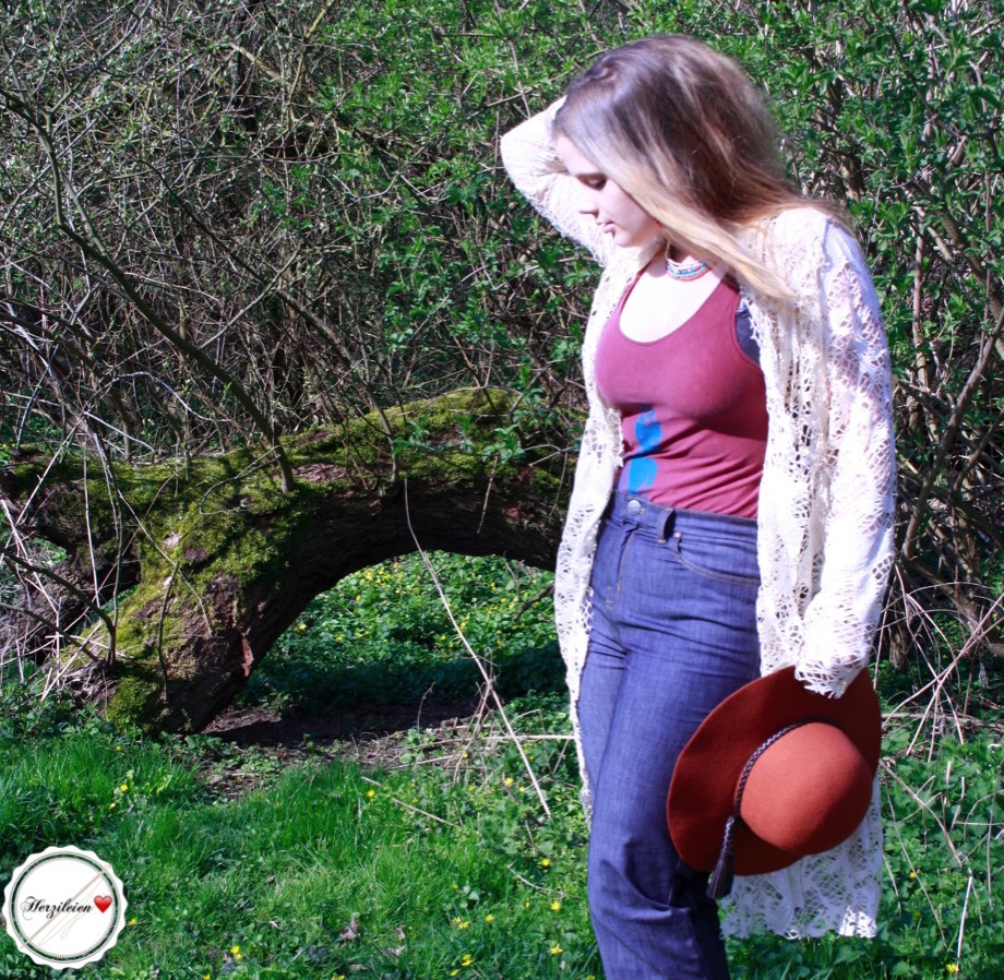 Eigentlich gibt gerade dieser Cardigan meinem Outfit den Hippie-Touch, der Netzjersey, der mit seiner Spitzenoptik so schön zipfelig fällt, so umspielt und etwas wie gehäkelt anmutet, der Schnitt und vorallem die Länge des Cardigans. In der Länge habe ich für diesen Look tatsächlich 30cm zugegeben, denn der Schnitt den ich verwendet habe ist eigentlich eine Jacke im modernen Stil, die aus einem anderen Material bürotauglich bis sofakuschelig sein könnte. Erstaunlich, was das Material für den Look doch ausmacht.