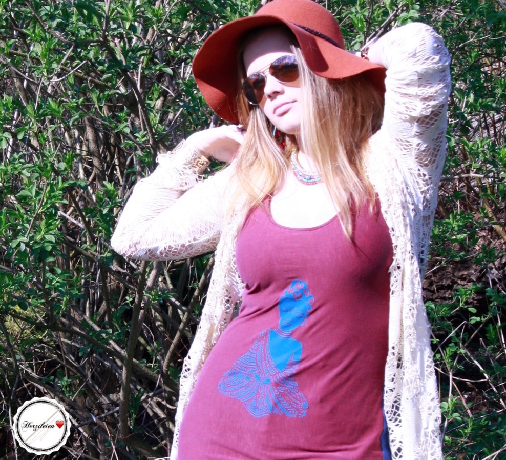Mein Top ist nach dem Tanktop Schnitt von AnniNanni entstanden. Um es etwas „ungeordneter“ wirken zu lassen, leicht grungig und auf keinen Fall wie frisch gekauft, habe ich darauf verzichtet es mit Bündchen zu versäubern und stattdessen rundum gesäumt. Passend zum „Free-your-mind“-Gefühl, dass mein Outfit mir vermittelt, habe ich dann eine tolle neue Plotterdatei von Fusselfreies auf das Top gepresst: den Buddha. Ich habe ihn allerdings umgekehrt entgittert, da ich keine strengen Linien haben wollte. Allgemein liebe ich es beim plotten, dass die gleiche Datei komplett anders wirken kann, wenn man mit positiv und negativ arbeitet- je filigraner desto besser funktioniert es.