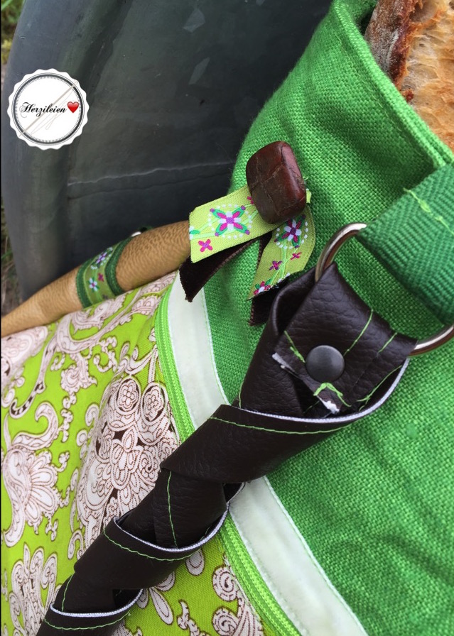 Da meine Stickmaschine nach einem Nadelcrash noch im Dornröschenschlaf steckt, ich habe es noch nicht geschafft mich auf Fehlersuche zu begeben, um sie wieder gangbar zu machen, musste ich auf aufwändige Dekoration der Tasche, wie ich die ursprünglich geplant hatte verzichten. Dafür habe ich mich an Details wie den Quasten an den Reißverschlüssen und den gewickelten Kunstleder-Gurten ausgetobt.