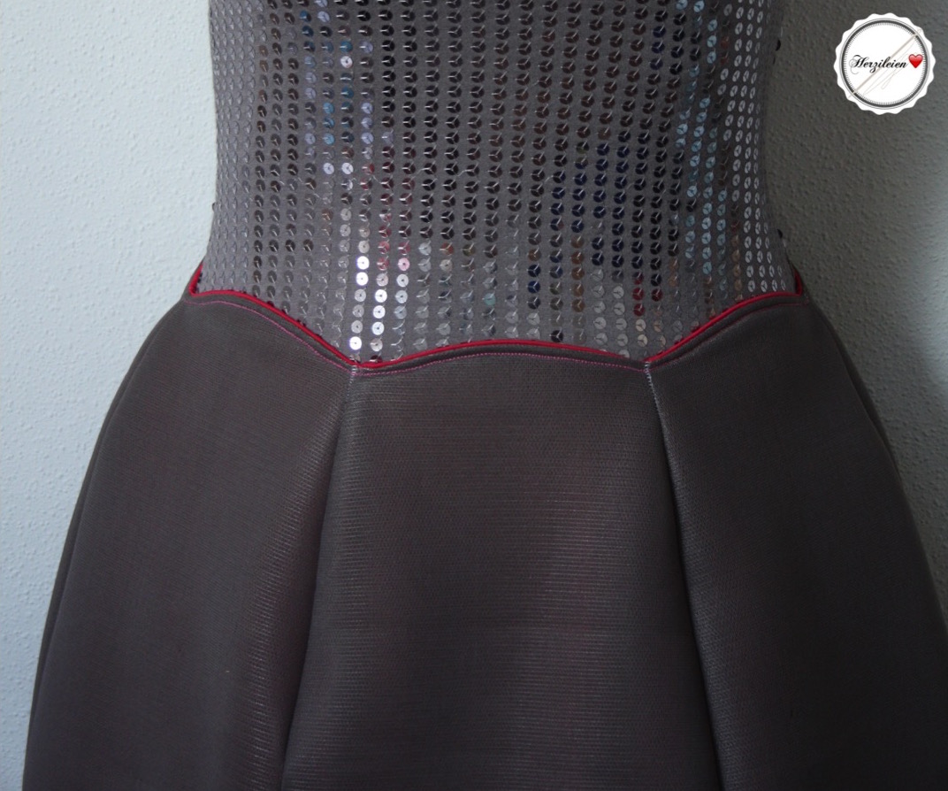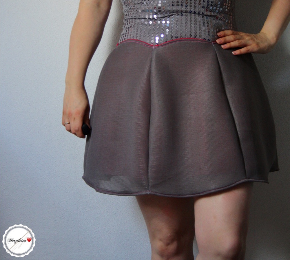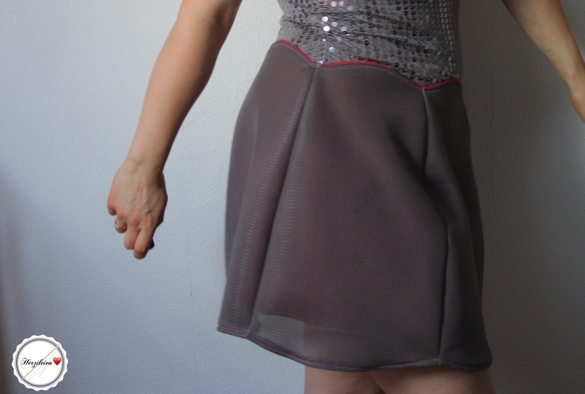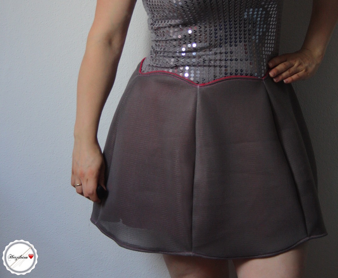 Der Paspeleffekt am oberen Abschluss ist ja genial – das sieht wirklich gut aus, eine sehr gute Lösung. Das Scuba-Netz macht sich mit dem Futter auch gut, mir gefällt, dass der Rock so schon von selber schön viel Stand hat, und trotzdem ganz leicht wirkt. Ich habe den Stoff in meinem Nebenjob ein paar Mal abgeschnitten, aber die meisten Käuferinnen wollten Taschen daraus nähen, daher finde ich es spannend, mal ein Kleidungsstück daraus zu sehen.