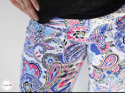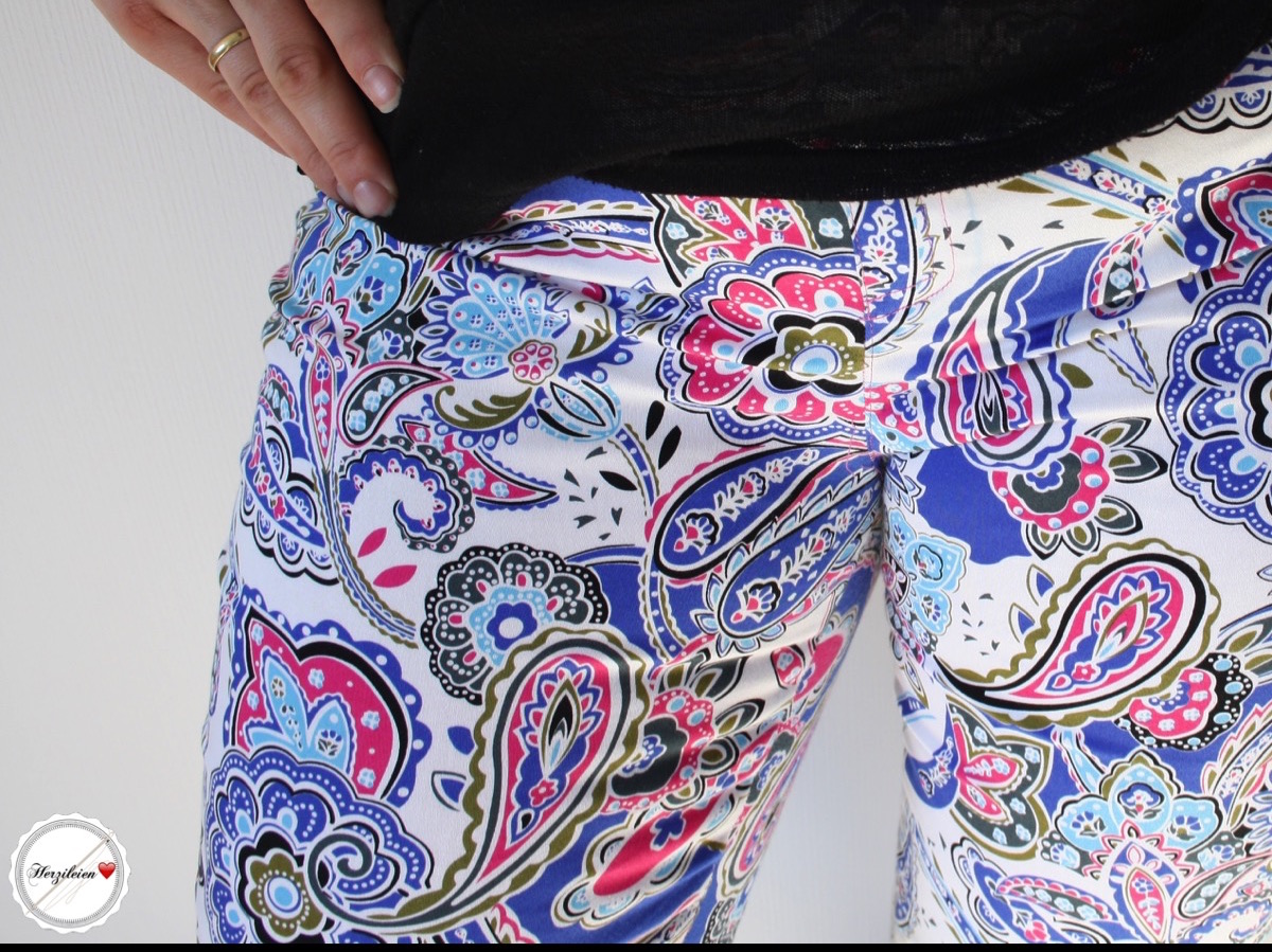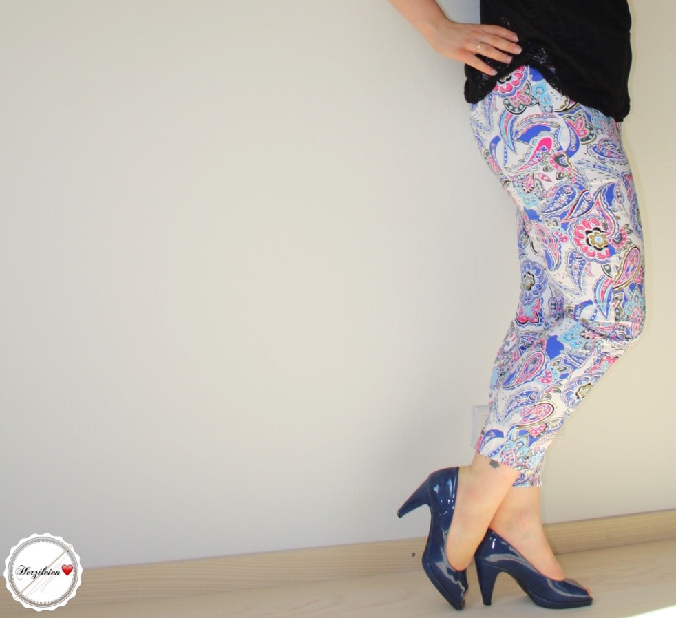 Ich bin leider nicht mit einer natürlichen Bräune gesegnet (was beneide ich meinen Mann und meinen Sohn um ihre tolle Haut!), sodass ich den größten Teil des Jahres in weiß aussehe wie eine Arzthelferin, aber sicher nicht frisch, sommerlich oder sexy. Wenn die ersten warmen Tage vorbei sind ändert sich das zum Glück, denn wenigstens werde ich braun und nicht rot! trotzdem fühle ich mich gerade bei Hosen sicherer, wenn das Weiß mit Muster daherkommt und nicht pur ist (Dass das für Mütter gerade wegen der schmutzigen kleinen Kinderhände, die immer auf Kniehöhe ihre spuren hinterlassen ohnehin praktischer ist, muss ich den anderen Müttern hier wohl garnicht erzählen…). Deswegen habe ich mich bei meiner Dinah dazu entschieden den Paisley Stretch, den ich letzten Herbst in der Annahme bestellt hatte, das die Farben etwas gedeckter wären, für eine Sommerhose zu verwenden. Und was mich richtig freut: es ist noch genug übrig um einen Rock oder ein Kleid aus dem Rest zu nähen- Dinah ist nämlcih erstaunlich stoffsparend, wenn man nicht auf die Richtung des Musters achten muss.