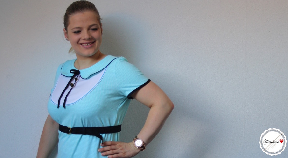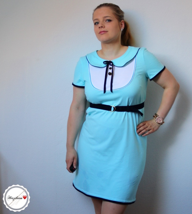 Der türkise Jersey ist ein Schlummerstoff, der weit über ein Jahr bei mir lag. Er ist von Stoffonkel, also ein Biostoff, etwas das ich mir nicht oft gönne, das es für das Kleid aber wert war. Aber türkis sommerlich zu kombinieren ist mir schwerer gefallen als gedacht. Ich wollte den „Barbie-Effekt“ vermeiden und war nicht sicher ob mir das mit weiß gelingt, aber braun, meine zweite Wahl, wirkte zu herbstlich für ein Sommerkleid. Ich habe also mit einer doppelten Paspel gearbeitet und das dunkle Blau der Schrägbänder mit den Knöpfen wieder aufgegriffen.