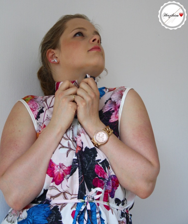 Beim Nähen der Bluse sind vorallem der Kragen und die Einfassung der Armausschnitte mit Schrägband nur mit viel Präzision schön umzusetzen. Der Kragen ist neben der Sprache auch das Element gewesen, weshalb die Bluse in der Herausforderungs- Auswahl gelandet war: Ich hatte bisher keinen Kragen angenäht und mir war nicht bewusst, dass es die gleiche Technik ist wie beim Annähen eines Bundes an eine Jeans… Ich hatte also einen mords R