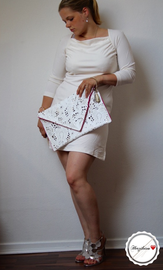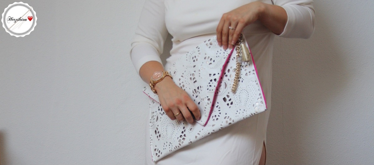 Ich habe schon vor ein paar Monaten eine Clutch ausgetüftelt, die sich schnell und aus vielen Materialien nähen lässt, und mit der Schlichtheit des Schnitts viel Raum für die Wirkung besonderer Materialien oder Details wie Stickereien oder Plotts lässt. (Hier könnt ihr die erste Version in Midi-Größe sehen)