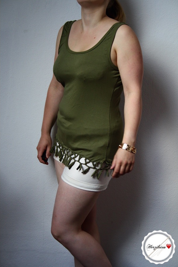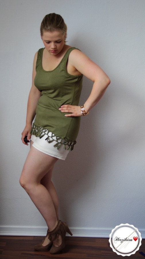 Das Ebook enthält darüber hinaus aber auch eine Babydollversion ohen Tassles, kann komplett bauchfrei genäht, oder weit eingeschnitten werden sodass sich lange Fransen ergeben. Und um zu verdecken was nicht frei sein soll gibt es noch dazu ein Bandeau-Top, das unter das Tassle-Top gezogen werden kann.