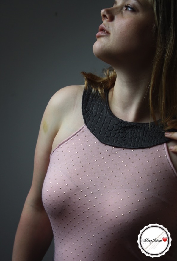 Einen Anfang hat für mich Mor Leylin gemacht. Dieses Mal habe ich den Schnitt in der kürzeren Version als Top genäht. Für den Kragen habe ich einen Rest von dem Scuba verwendet, den ich beim ersten Prototyp meines Rocks eingesetzt habe. Daher ist das Top jetzt wie gemacht für den Rock.