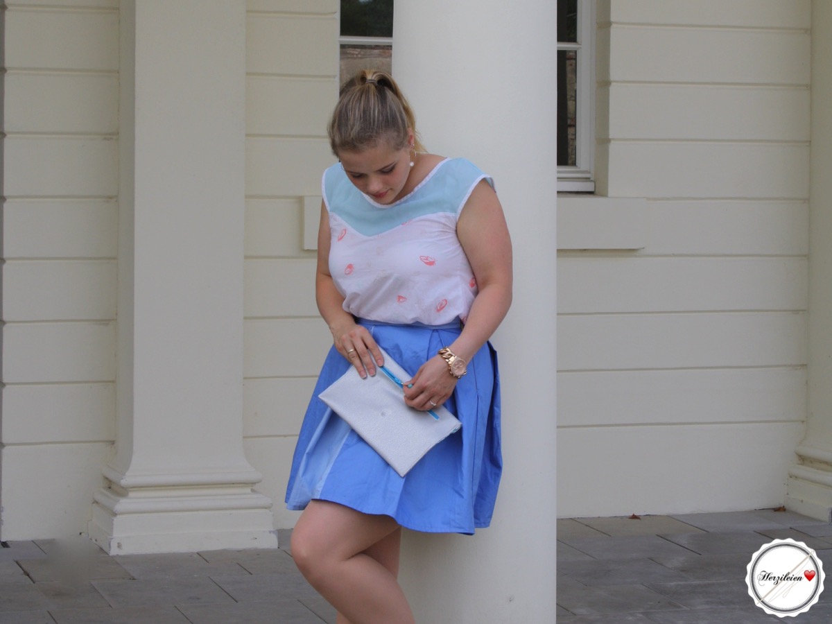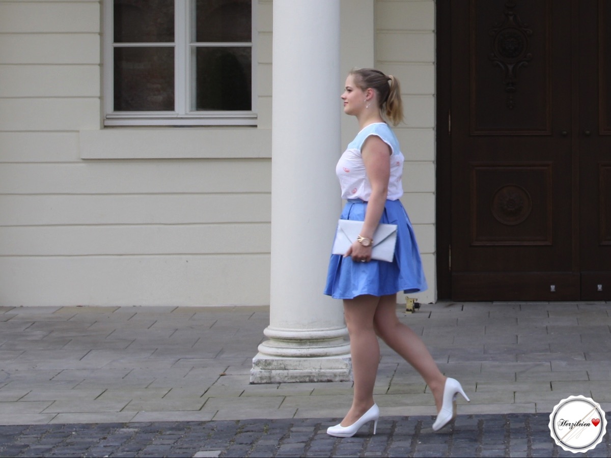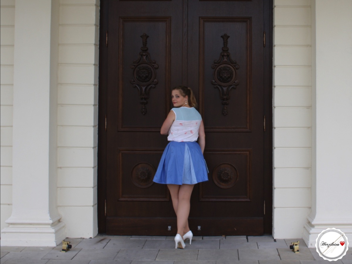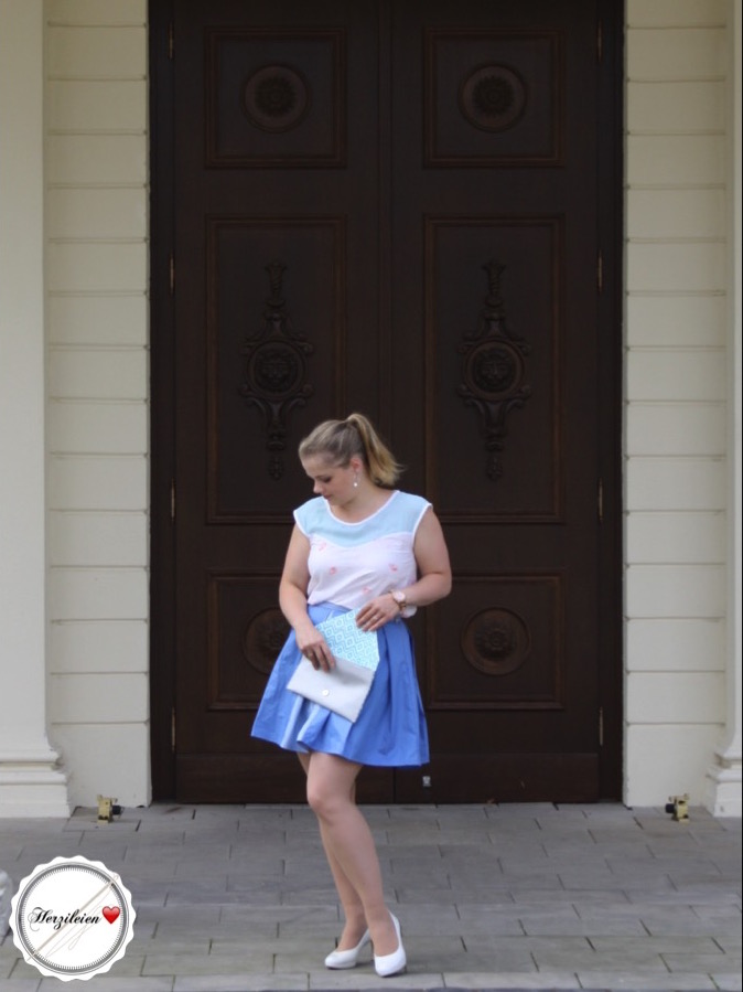 Mein heutiger Beitrag, das stimmt ich etwas wehmütig, ist, wenn ich dem Wetterfrosch in meinem Handy glauben kann, wohl einer der letzten sommerlichen in diesem Jahr. Unglaublich, wie schnell die Zeit vergeht… Ich habe daher dieses Mal mein letztes, euch noch nicht gezeigtes Frühsommer-Blusenshirt und meinen zweiten, seit Ewigkeiten fertigen Capone- Faltenrock in die letzten Sonnenstrahlen ausgeführt. Kombiniert mit einer ganz schlichten Oribel-Clutch in Silber-Türkis.