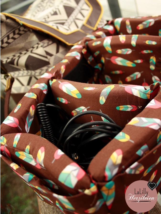 Die Tasche war erstaunlich schnell genäht, ich hatte mch auf einen deutlich größeren Zeitaufwand eingestellt. Da eine Kamera immer viel Zubehör mit sich bringt, habe ich alle im Ebook enthaltenen Fächer und Taschen eingenäht. Was mir im Praxistest dann etwas fehlte, war aber ein möglichst kleines Steckfach oder Reißverschlusstäschchen, in dem Speicherkarten und Reservebatterien Platz finden. So ein Fach könnte man, im Nahinein betrachtet, noch im Schnitteil für das Große Steckfach oder darauf unterbringen- aber auch hier ist das Meckern wieder an einer Kleinigkeit- man kann für diesen Kleinkram natürlich auch die vorhandnenen zwei Reißverschlussfächer nutzen….
