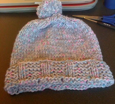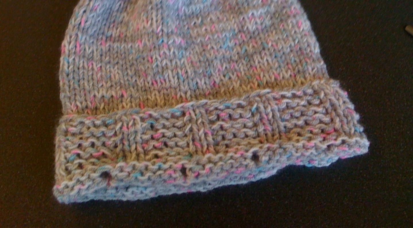 Sind 6cm im Bündchen Muster erreicht wird nach jeder 5. Masche eine Masche aufgenommen, dann glatt links gestrickt. (  Das Bündchen wird durch umschlagen anschließend auf der Seite der rechten Maschen liegen…)