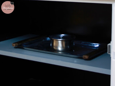 Auch die Hängeleiste, die Haken und die Körbchen für Kochlöffel und Co hatte ich noch aus meinen vergangenen Küchen im Keller aufbewahrt, und für die Geschirr-ausstattung fanden sich 4 Mini Puddingschalen, vier Wichtel und einige andere Teile aus dem Tupperschrank.