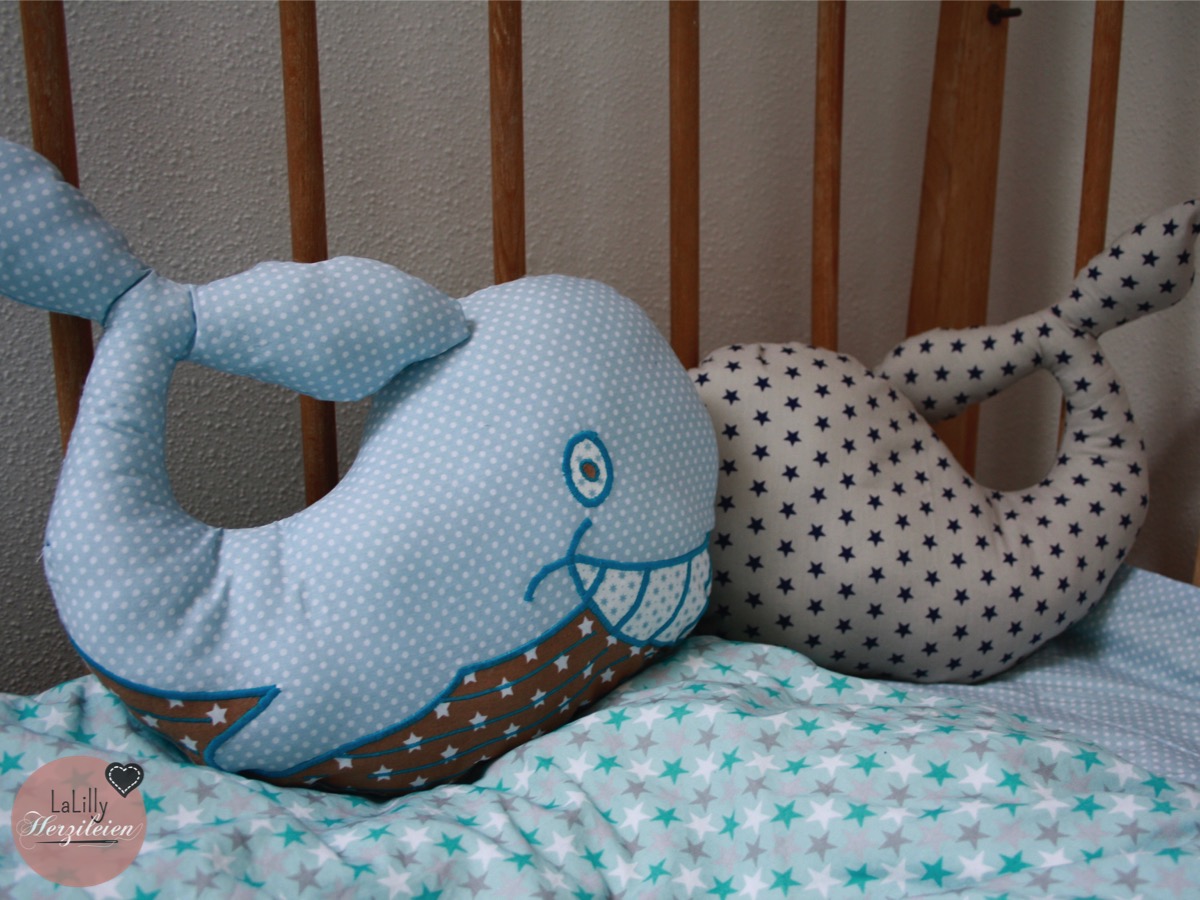 Aus diesem Wunsch und Gefühl heraus, in der Hoffnung, dass die beiden für einen Ort der Ruhe und zufriedenheit im Kinderzimmer sorgen, sidn WALther und WALtraud entstanden. Zwei Wale, die in verschiedener Weise das Kinderzimmer mitgestalten sollen, und die ihre erste Wirkungsstätte als Kissen im Kinderbett gefunden haben.