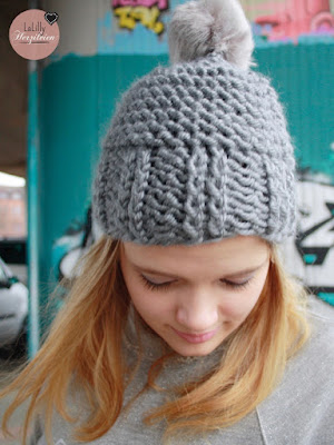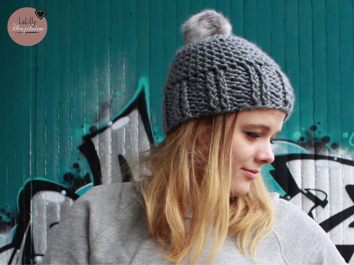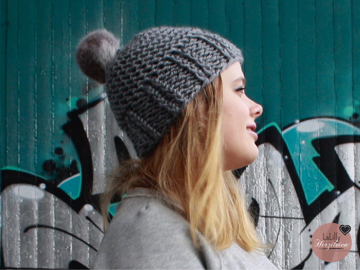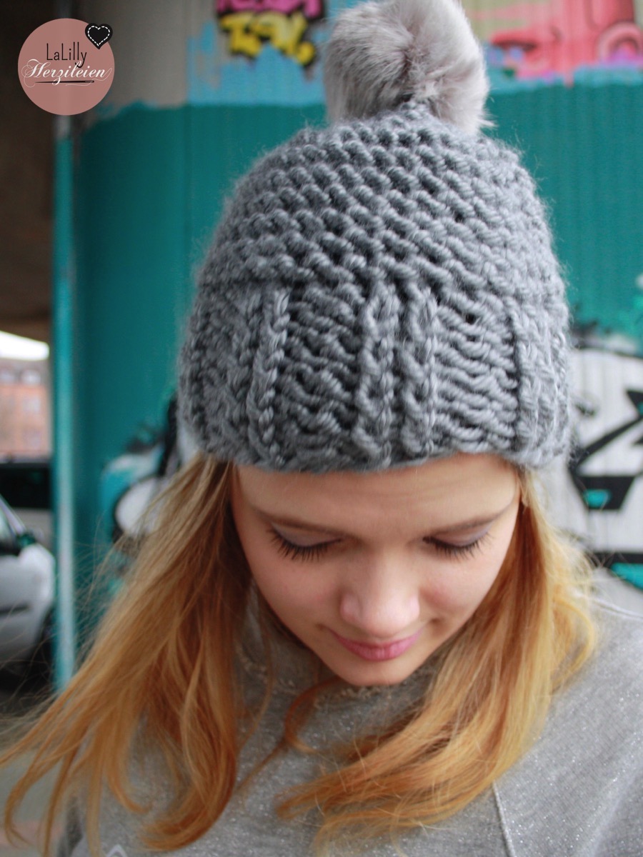 Schon im herbst habe ich einen Strcikloop aus dicker, senfgelber Wolle gezeigt. An der Naht hatte ich ihn mit einem grauen Detail versehen (hier gehts zum Beitrag). Von dieser grauen Wolle hatte ich noch ein Knäul übrig, und als mir nach dem letzten Stoffmarkt ein grauer Bommel aus Kunstfell in die Hände fiel, war die Mütze in meinem Kopf schon „geboren“.