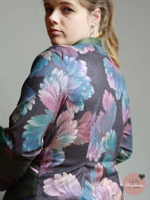 Der Stoff, ich hatte es geahnt, stellte mich vor eine kleine Herausforderung. Er fällt wundervoll weich, ähnlich wie ein Viskosejersey, und fasst sich unheimlich gut an. Zudem ist er leicht elastisch. Für die Carja musste ich ihn versteifen, da der Schnitt einen Stoff mit etwas Stand benötigt- daher habe ich sie mit dem grünen Stretch, den ich auch für die Details verwendet habe, gedoppelt genäht. Ich denke, mit einer solchen Stabilisierung kann man sogar Taschen aus dem Stoff nähen, für die ich die Optik ebenfalls sehr schön finde.