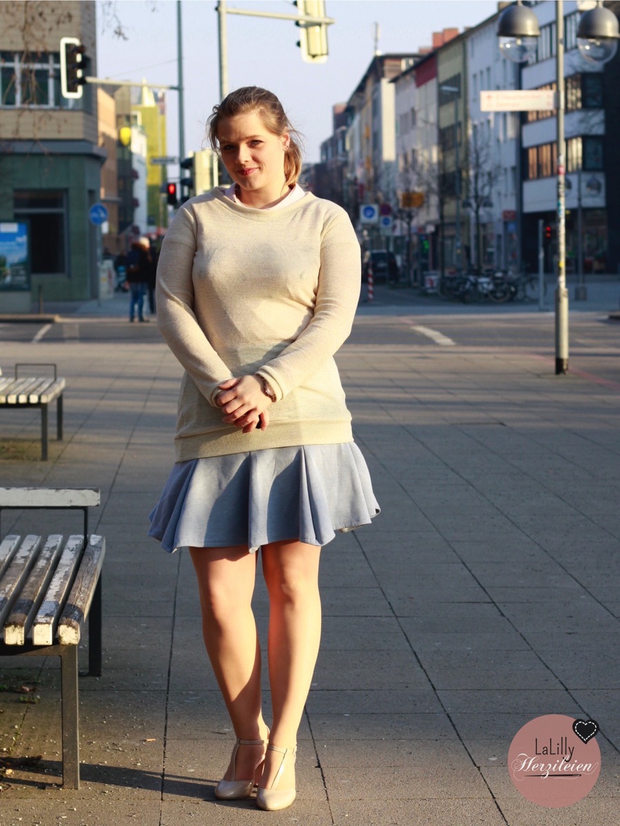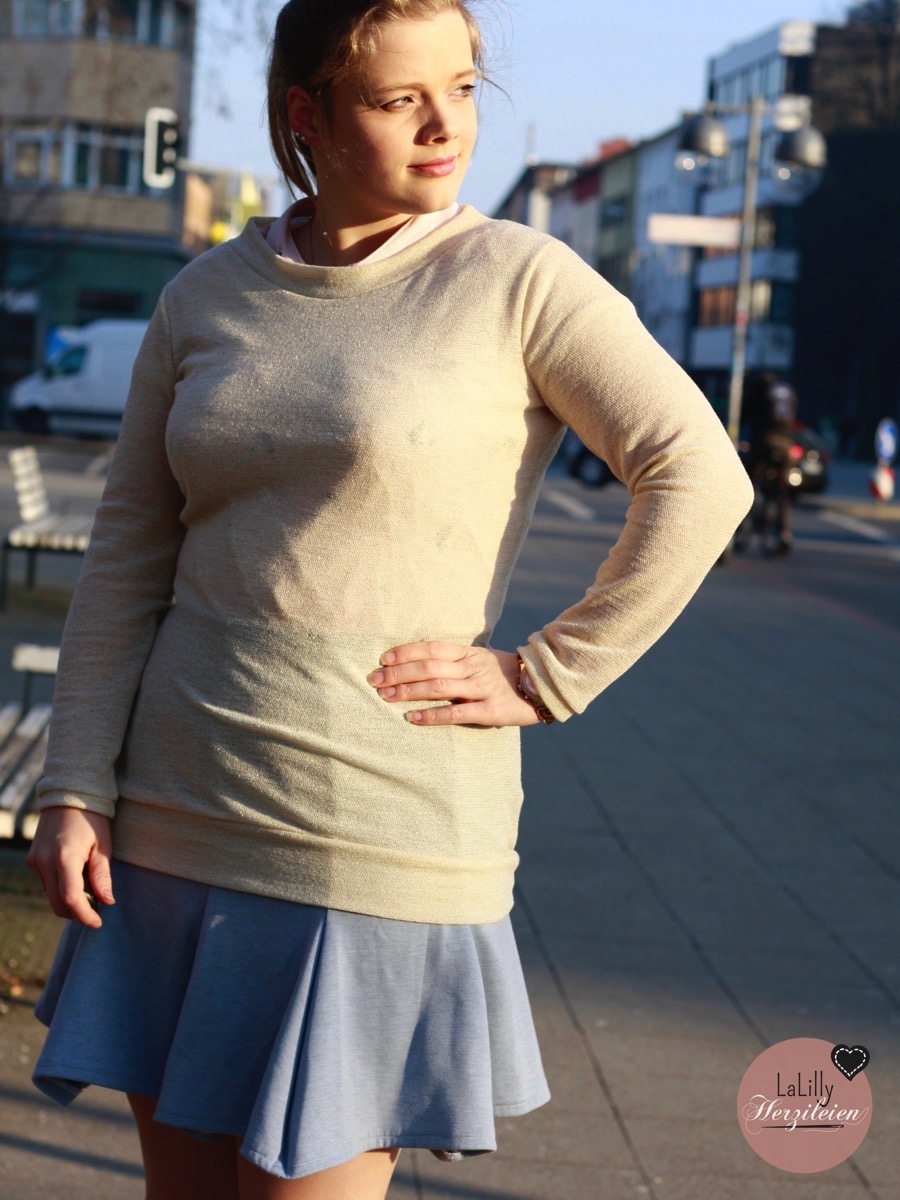 Pullover: Missy von „Melians kreatives Stoffchaos“, gibt es hier*; genäht aus sandfarbenem Glitzerstrick von Stoffhandel Caplan über die Facebookgruppe „Stoff-Kamera-Liebe“.