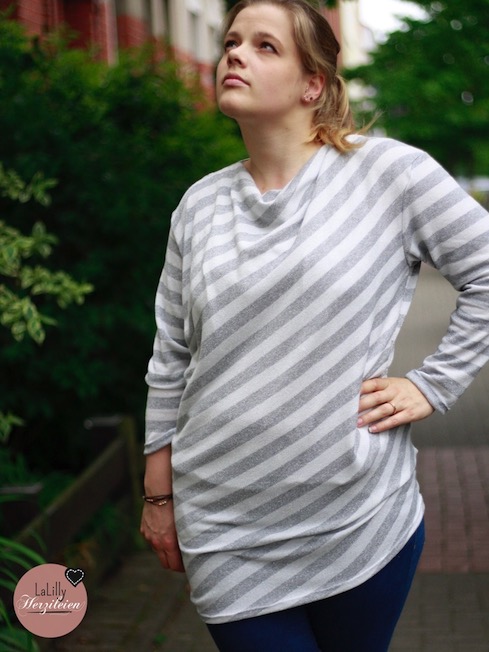 hier) von SO! genäht, und fand beim Stöbern Lola auf meiner Festplatte wieder. Ich trage den Schnitt etwas weniger gerafft als er eigentlich vorgesehen ist, aber ich finde die Assymmetrie so einfach toll. Besonders interessant ist, dass es außer den Ärmeln nur ein einziges Schnittteil gibt. Bei Streifen ist es dadurch etwas schwierig in der Naht richtig aufeinander zu treffen, den Abstrich musste ich machen, aber ich mag sehr, dass die Streifen durch die Schnittführung im Vorderteil diagonal verlaufen.