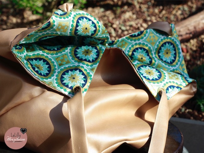 Innen habe ich einen Patchworkstoff von Riley Blake verwendet, den ich eigentlich für ein anderes Taschenprojekt gekauft hatte, und der mich immer an die Kacheln in orientalischen Gebäuden erinnert. Da das Gold so gut passte, konnte ich nicht widerstehen ihn hier zum Einsatz zu bringen. Welche Taschentypen seit ihr? Mögt ihr Beutel, oder lieber ausgefeilte Lösungen zur übersichtlichen Verstauung von allen Kleinigkeiten, die in die Tasche müssen?
