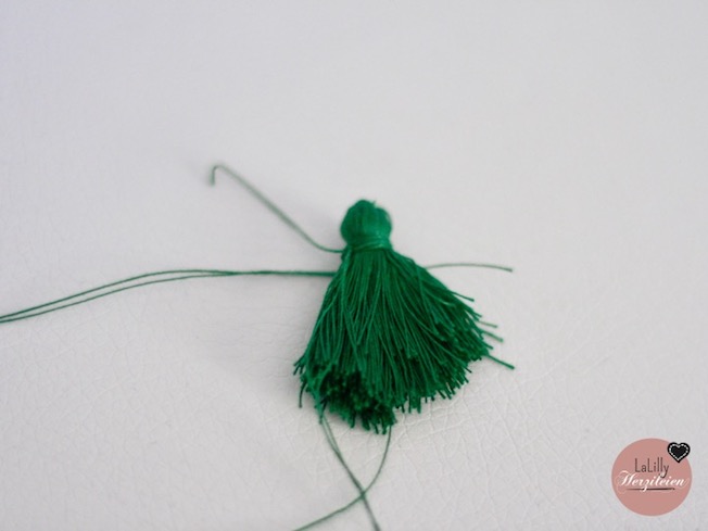 Nun ist deine Tassel fast fertig- allerdings sieht sie noch etwas wild aus, weil noch nicht alle Fäden gleich lang sind und Fadenenden vom Verknoten und Umwickeln abstehen. Nimm erneut die Schere zur Hand und „frisiere“ deine Quaste etwas, bis die Länge stimmt und schneide die überstehenden Fadenreste ab. Dann kannst du sie annähen, zu Schmuck verarbeiten, auf einen Schlüsselring ziehen oder, wie ich es gemacht habe, am Ende eines Anhängers als Abschluss auffädeln.